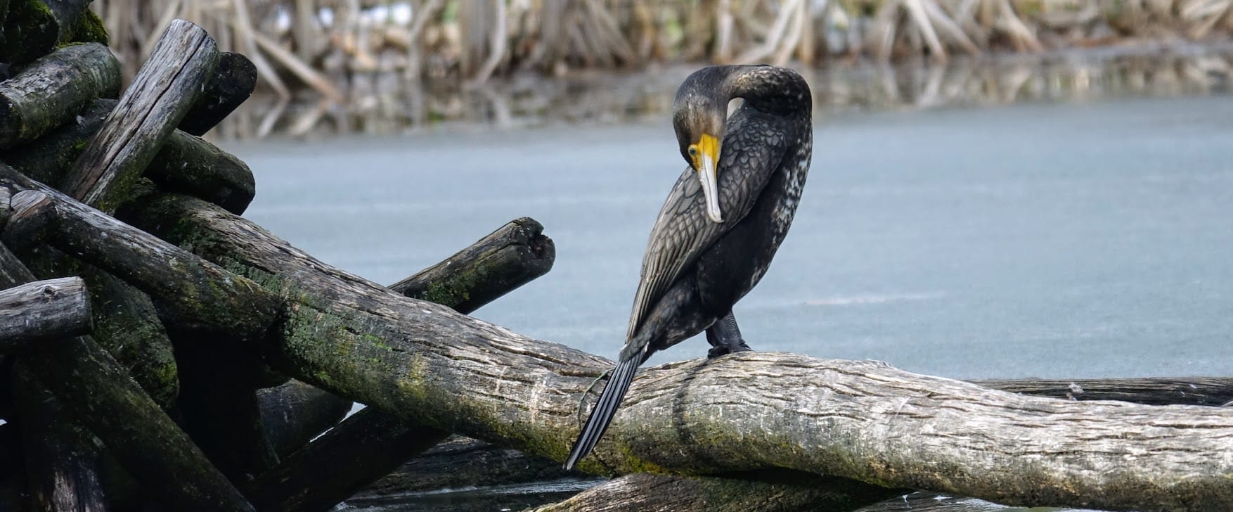 Da staunten selbst eingefleischte Kenner des Nestweihers: Der heimliche Star unserer Quartieroase, der Graureiher, erhielt Konkurrenz. Am Dienstag, 16. Februar wurde erstmals ein Kormoran gesichtet.