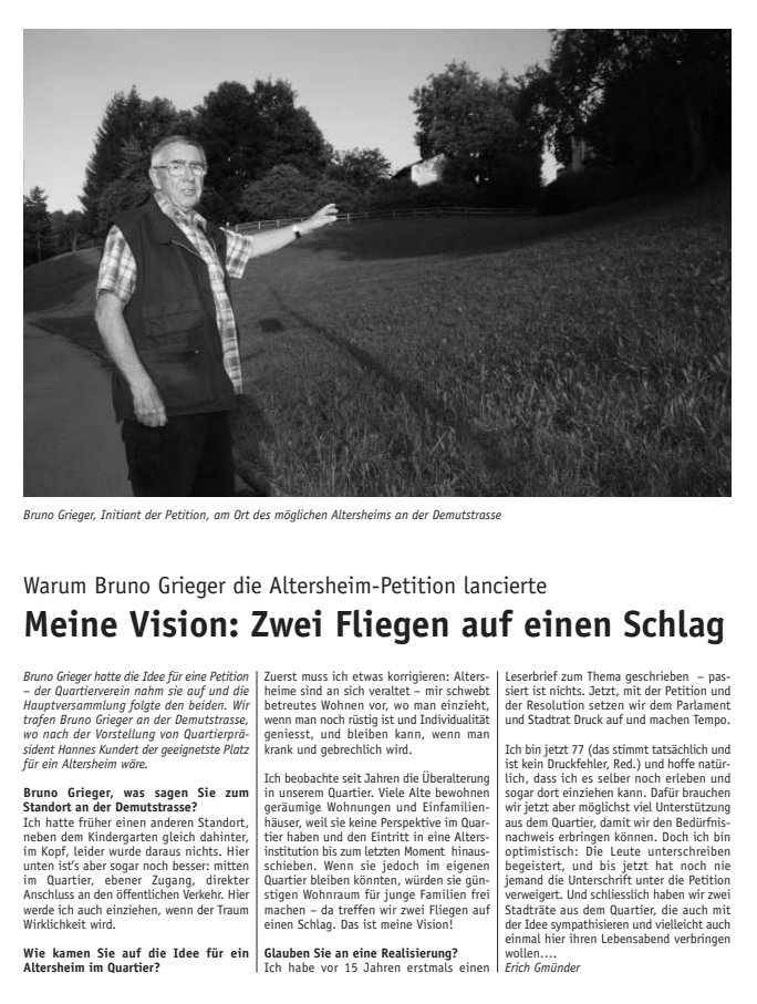 Betreutes Wohnen im Alter an der Demutstrasse: Bruno Grieger regte im Jahr 2008 die Petition an, die vom Quartierverein lanciert und 2009 mit über 1100 Unterschriften eingereicht wurde. QZ Riethüsli 2/2008)