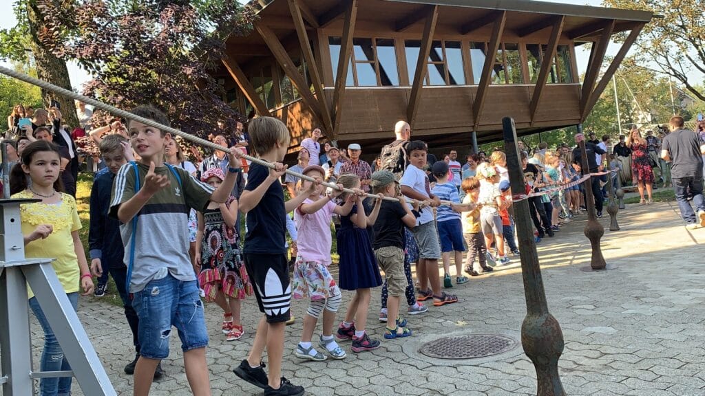 Den Anfang des Festtages machte der feierliche Aufzug der kleinen Glocke auf den Turm der evangelischen Kirche. Mit vereinten Kräften zogen Dutzende Kinder die 180 kg schwere, bekränzte Glocke in die Höhe, wo sie von Mitarbeitern der Glockenfirma Muff in das Geläute integriert wurde.